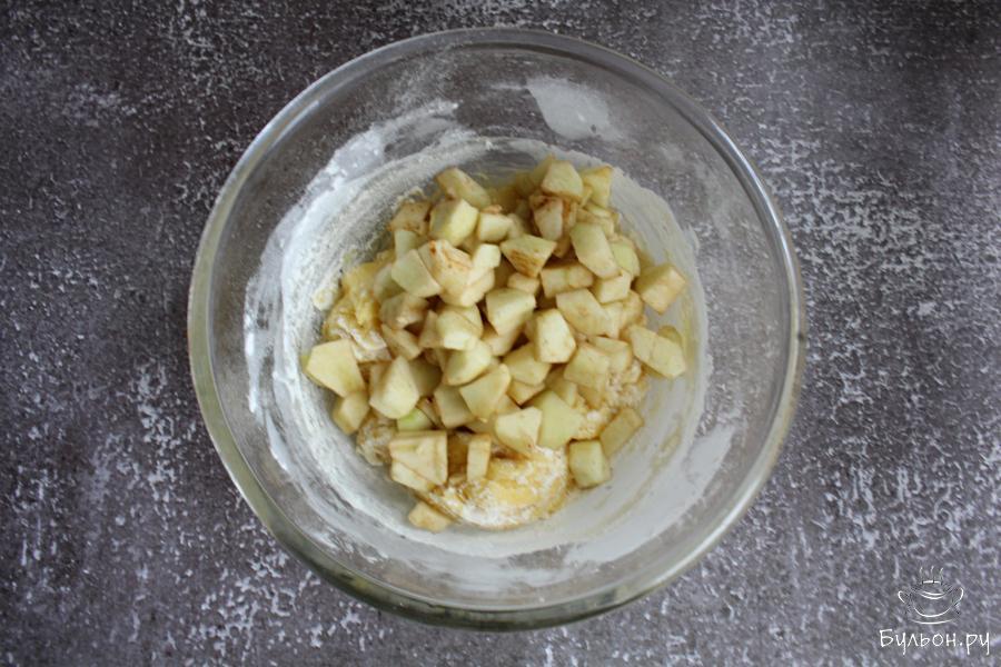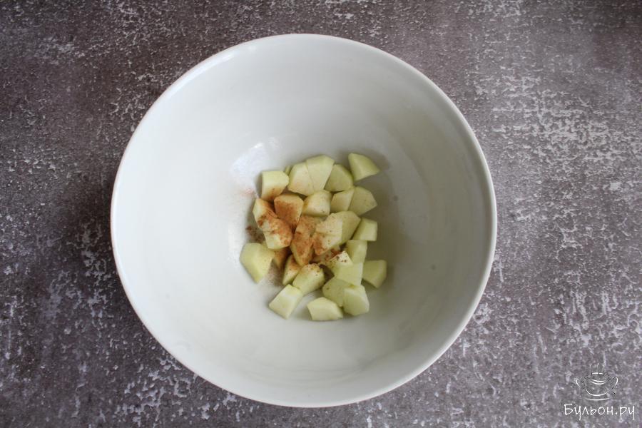 6. Яблоки почистить от кожуры и семян, нарезать яблоки мелкими кубиками. Добавить к яблокам корицу и перемешать.