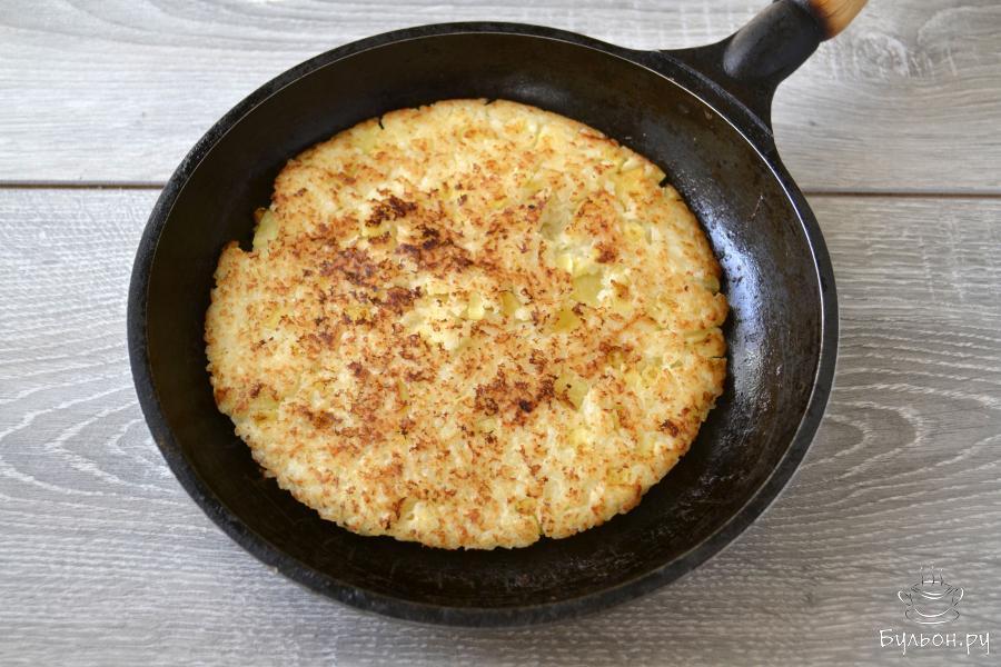 5. Разогрейте сковороду со сливочным маслом и выложите 1/2 массы, толщиной примерно 1,5 см. Ложкой разровняйте поверхность. На самом слабом огне, под крышкой, готовьте запеканку примерно 10 минут. Когда нижняя сторона подрумянится, накройте сковороду тарелкой и резко переверните.