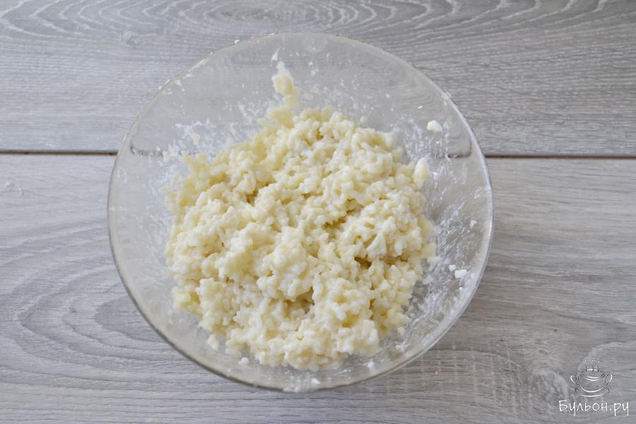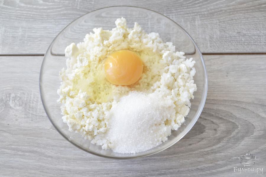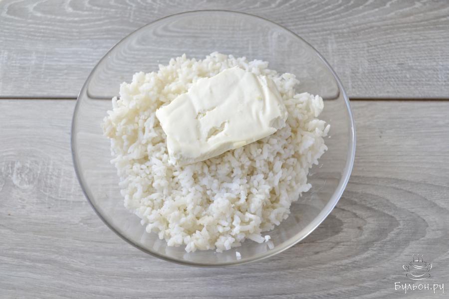 1. Для приготовления запеканки можно использовать рис, который остался от обеда (у меня вареный рис 300 г.) или промойте и сварите рис. Соотношение риса и воды 1 к 2. Рис остудите, положите в глубокую миску и добавьте творог. Перемешайте рис с творогом.