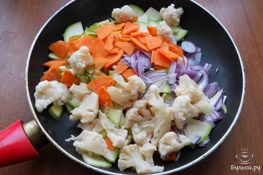6. Добавить к овощам порезанную тонкими кружочками или полукружками морковь и соцветия цветной капусты.