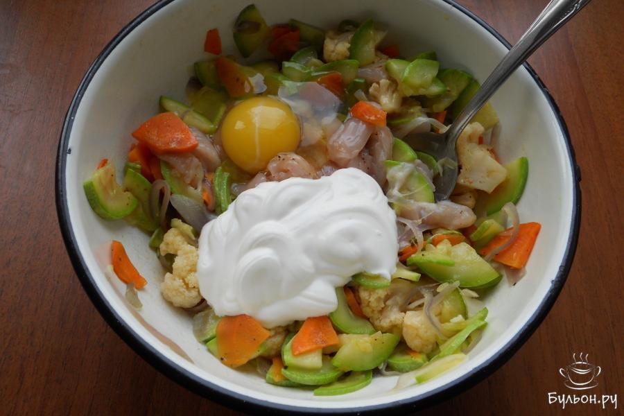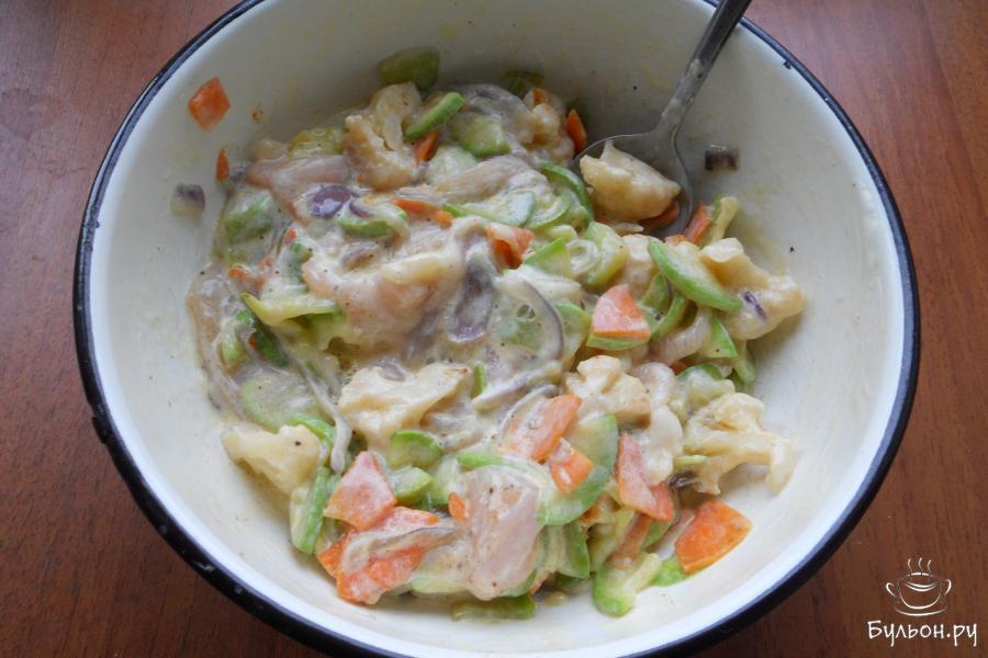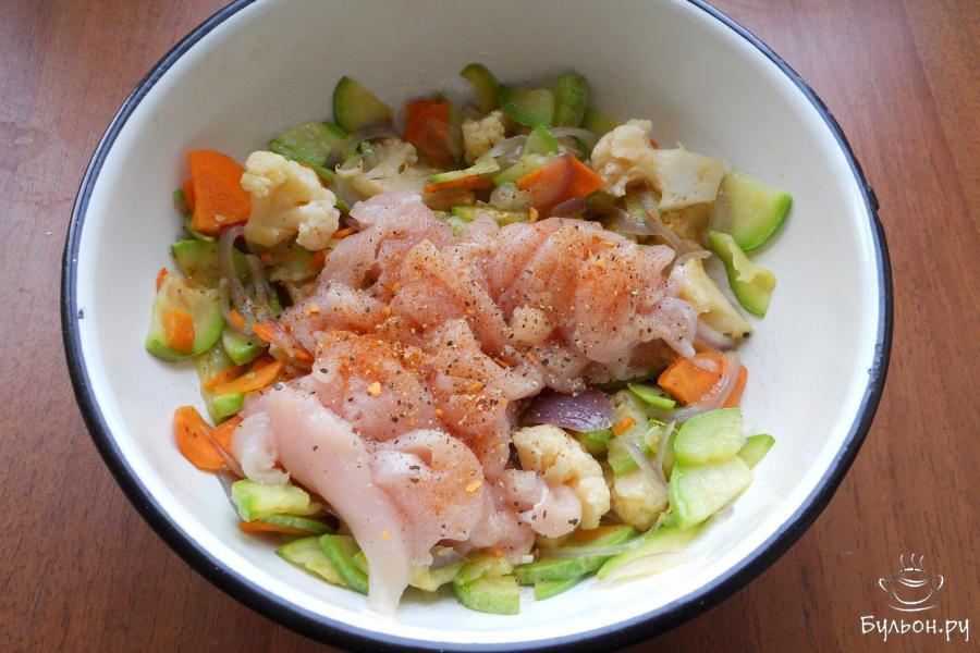 8. Выложить овощи в миску, остудить. Добавить порезанную тонкими пластинами куриную грудку, предварительно освобожденную от кости. Немного посолить и посыпать приправой, поперчить.