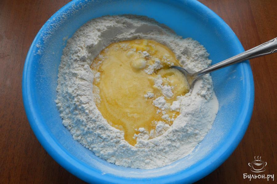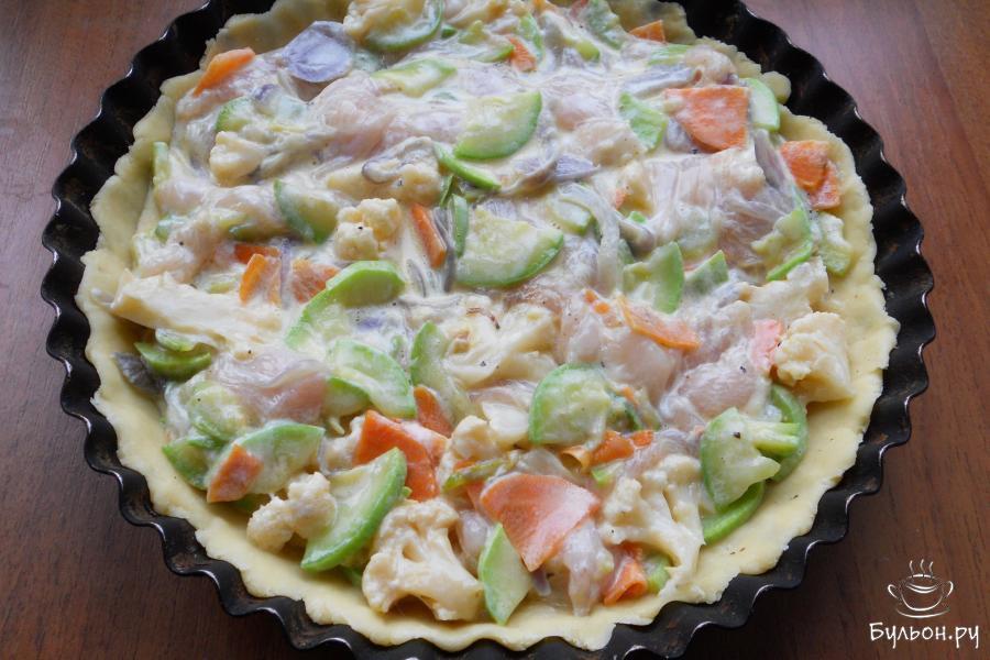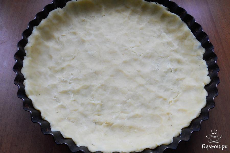 4. Тесто утрамбовать по форме для пирога, сформировав бортики. Поместить форму с тестом в холодильник на 30 минут.