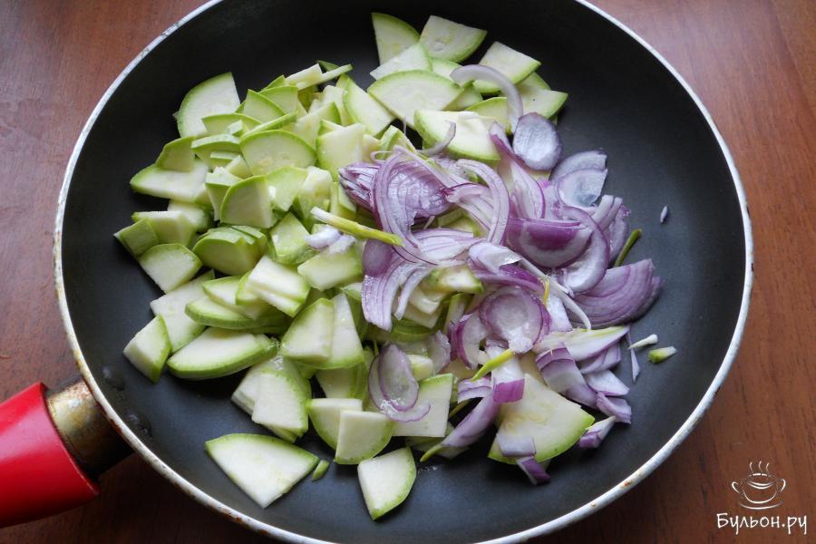 5. Приготовить начинку: кабачок порезать тонкими кусочками, добавить порезанный тонкими полукольцами или четвертинами лук. Все выложить в сковороду, влить растительное масло.