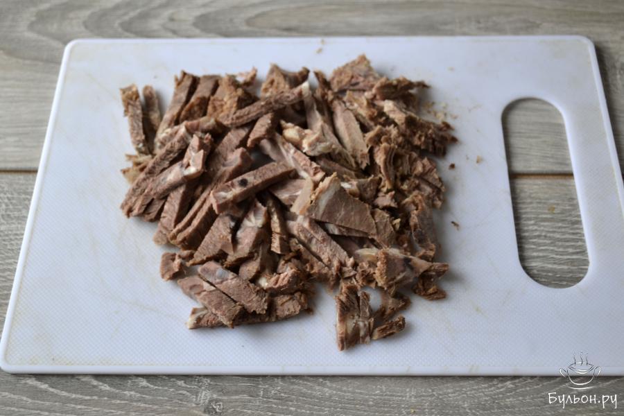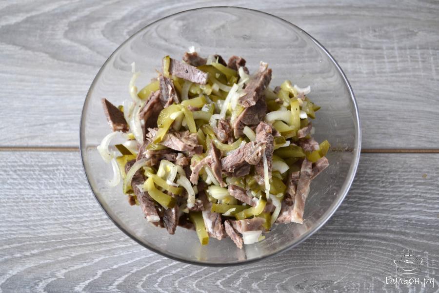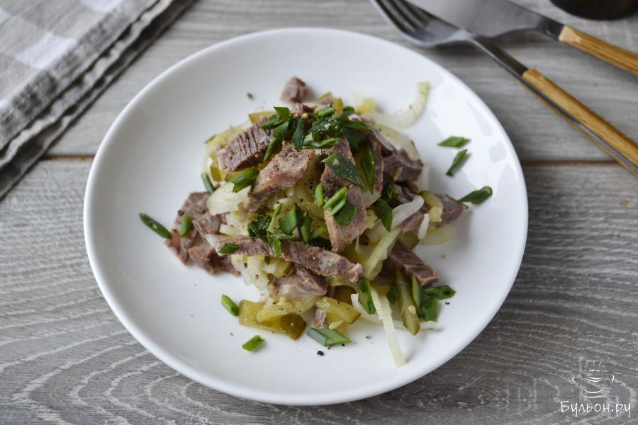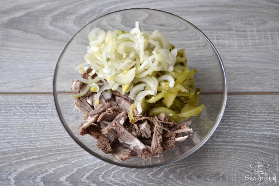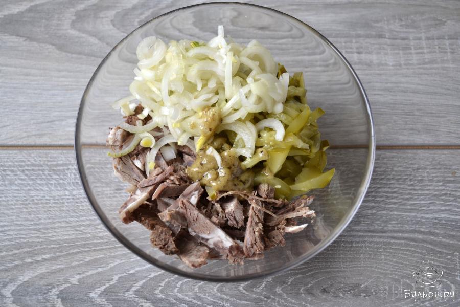 Для приготовления салата понадобится вареная говядина, маринованный огурец и маринованный лук. Кусок говядины можете отварить специально для салата или взять часть вареного мяса, если вы варите суп из говядины. Лук обязательно замаринуйте, он получится с пикантным вкусом и не такой острый, как свежий. Для заправки возьмите русскую горчицу или горчицу в зернах и растительное масло. Салат получается пикантный, сытный и очень вкусный.