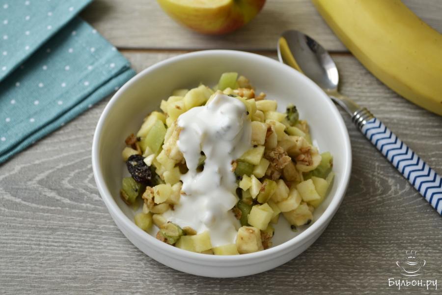 4. Салат из фруктов подавайте сразу же. Полейте салат натуральным йогуртом. Вместо йогурта можно взять сметану, кефир, ряженку, греческий йогурт. Салат очень вкусный, сладкий. Приятного аппетита!