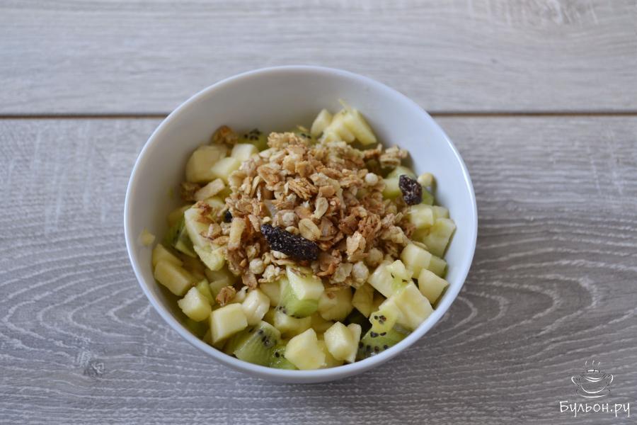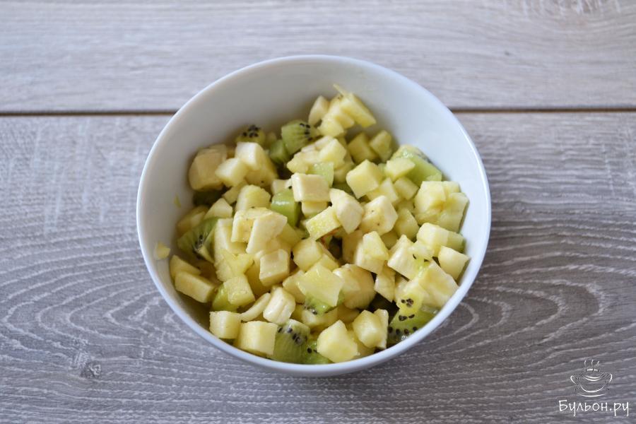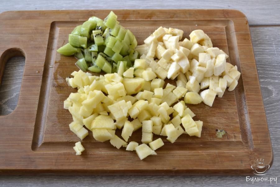 1. Вымойте фрукты: киви, яблоко. банан. Банан, яблоко и киви очистите от кожуры и нарежьте не крупным кубиком.