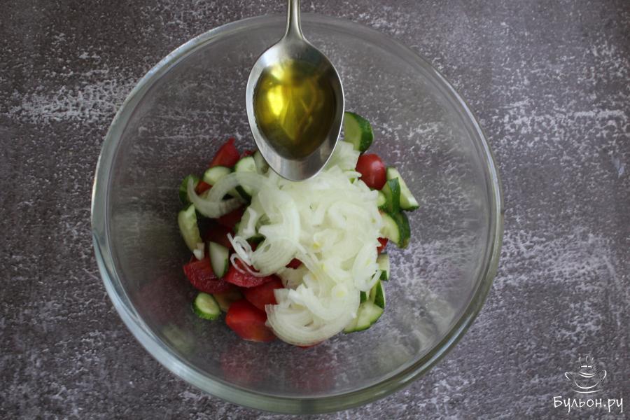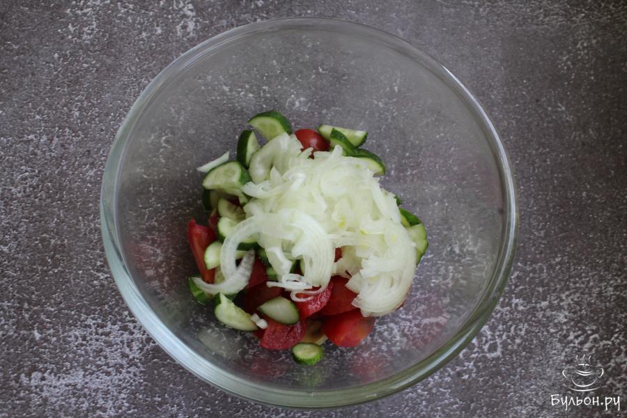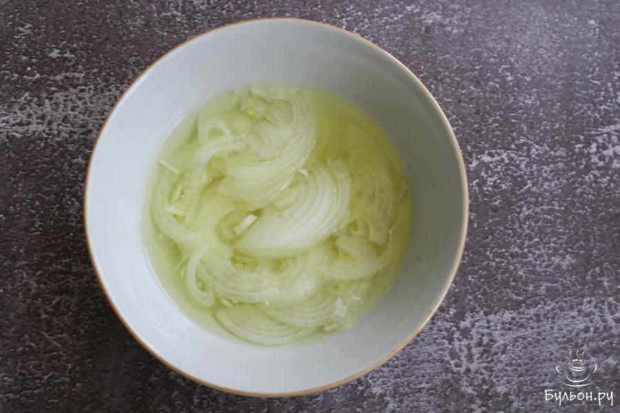 2. Лук почистить, промыть, тонко нашинковать и залить лук маринадом от грибов. Оставить лук на 10 минут.