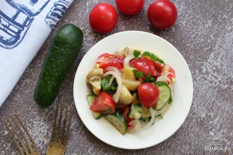 Салат с маринованными шампиньонами, помидорами и огурцами можно подать, как к повседневному столу, так и предложить для вегетарианского и постного меню. Салат готовится за считанные минуты, просто и быстро. Салат получается легкий, очень сочный, ароматный и вкусный. Помидоры для приготовления желательно выбирать небольшие, плотные и сладкие. Такой салат наверняка понравится многим, попробуйте приготовить его по этому рецепту.
