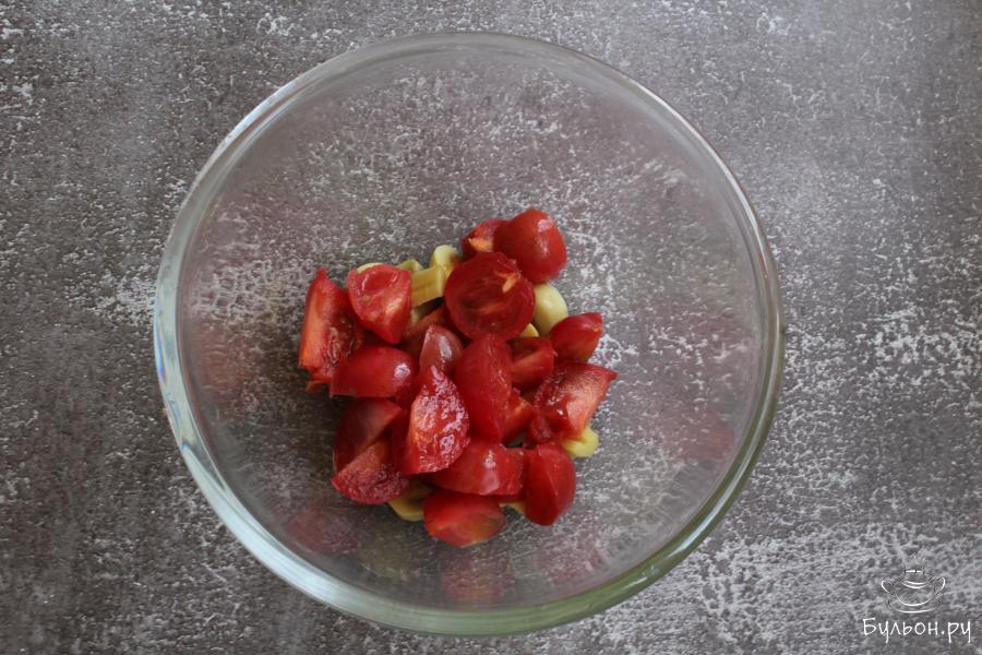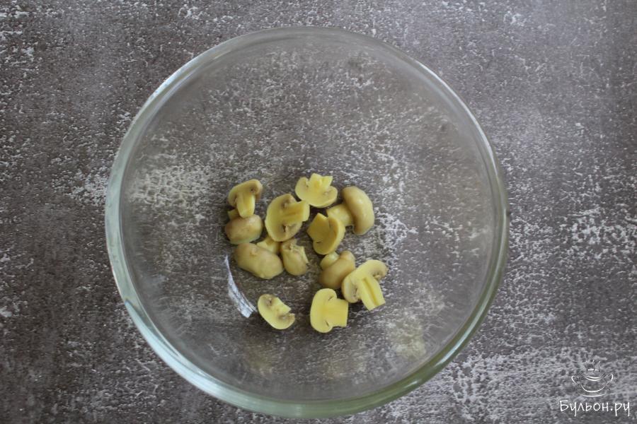 1. Грибы достать из маринада. Если шампиньоны крупные, то разрезать их пополам. Мелкие грибочки можно оставить целыми.
