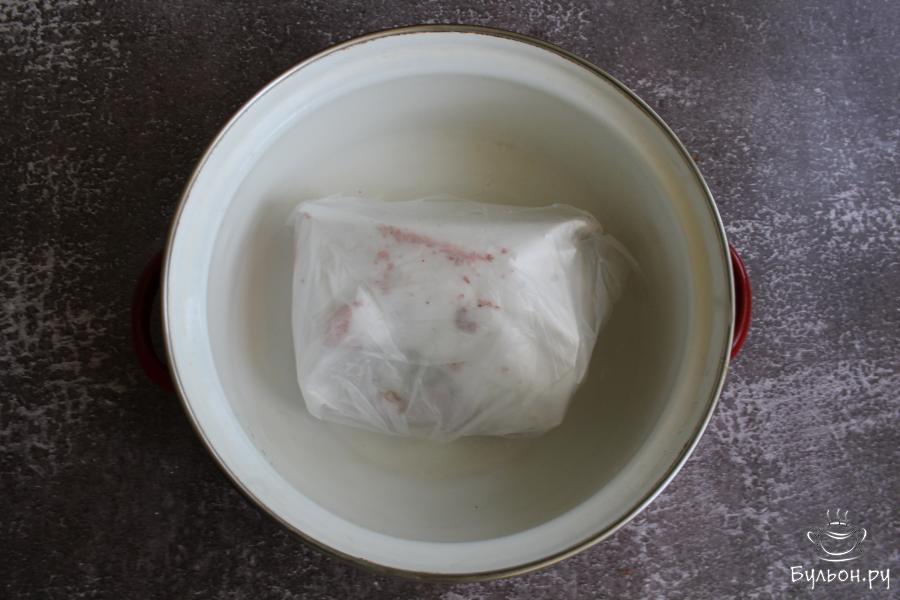 8. Пакет с салом положить в кастрюльку, залить водой. Варить сало 4 часа. Готовое сало оставить в воде и дождаться когда оно полностью остынет.