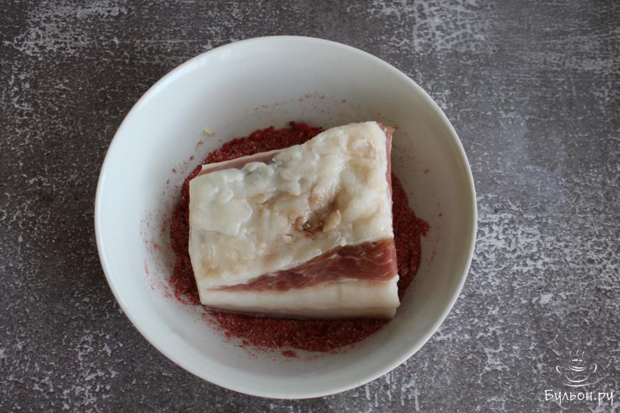 4. Все куски сала тщательно обмазать со всех сторон душистой смесью. Оставить сало мариноваться 2-3 часа.