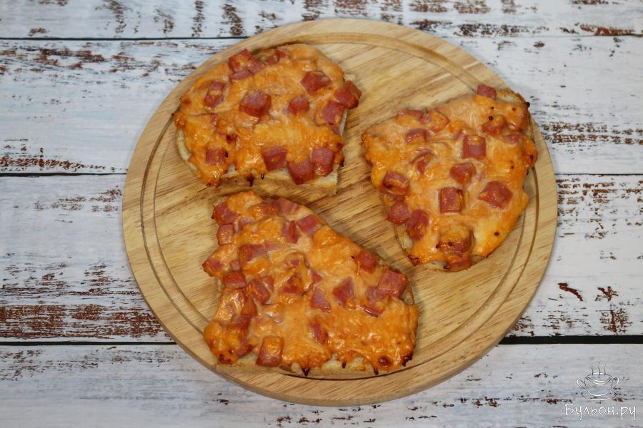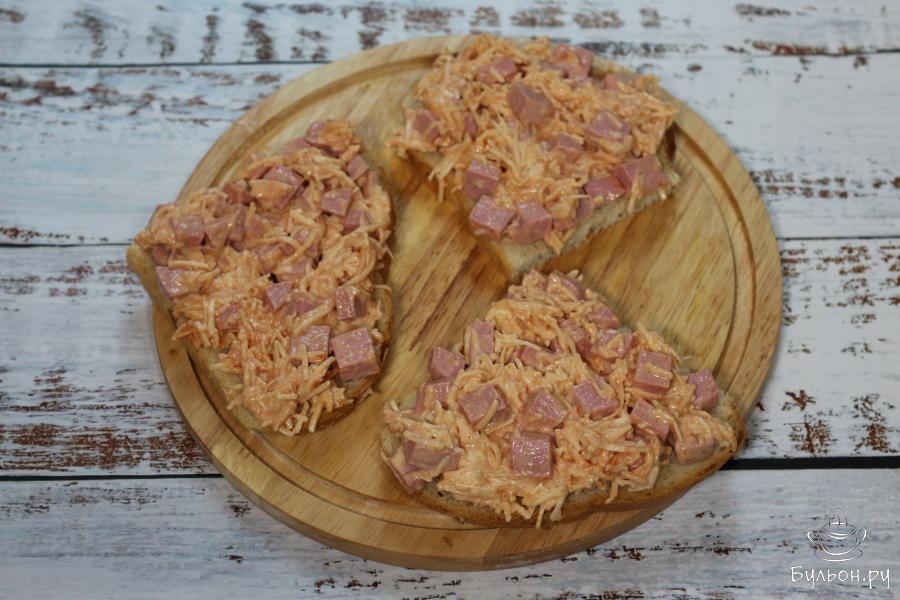 6. Бутерброды положите на пергамент и отправьте их в разогретую духовку. Выпекайте бутерброды 12 минут при 180 градусах Цельсия. Подавайте горячими.