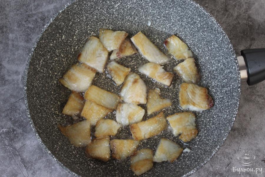 2. На растительном масле обжарьте кусочки рыбы с двух сторон. Обжаренную рыбу переложите на чистую тарелку.