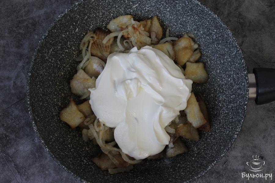 4. Верните кусочки тилапии в сковороду, добавьте сметану, посолите, при желании добавьте свои любимые специи, аккуратно перемешайте и тушите на медленном огне, под закрытой крышкой, в течение 15 минут.