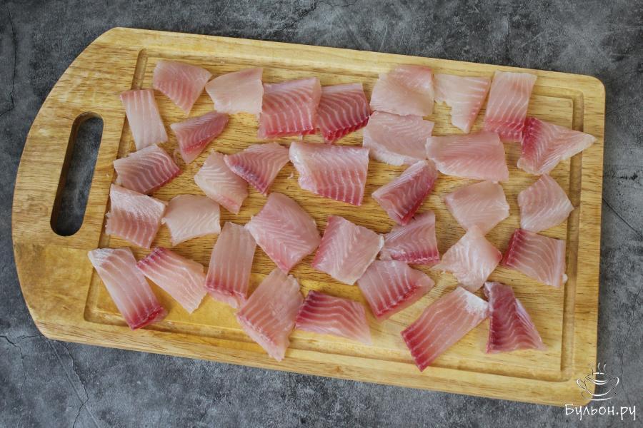 1. Рыбу промойте под водой и обсушите бумажными полотенцами. Из филе тилапии извлеките косточки, если они были, и нарежьте рыбу на средние кусочки.