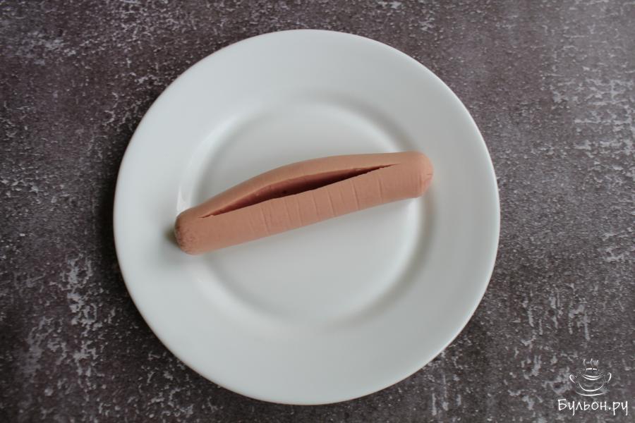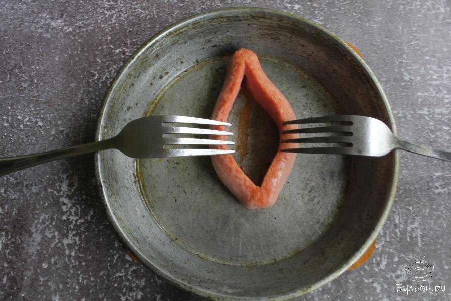 2. Сковороду с маслом хорошо разогреть. Выложить сосиску на сковороду, раскрыть ее, как лодочку, при помощи вилок или металлических палочек. Держать ее в раскрытом состоянии минуту. Сосиска зафиксируется, затем перевернуть ее.