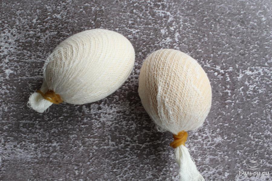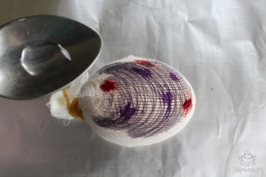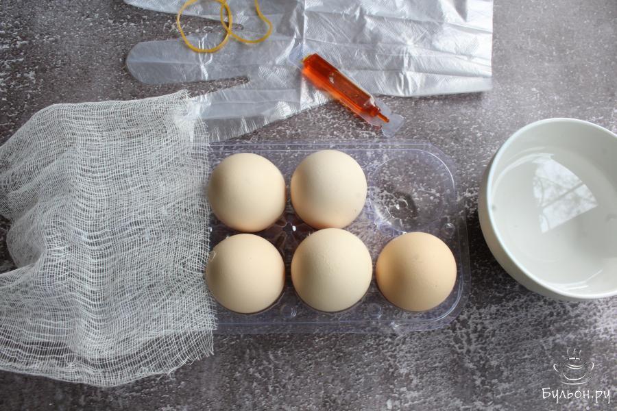 1. Подготовить все необходимое: чашку с водой, перчатки, пленку, красители, марлю, резинки, подставку под яйца. Яйца сварить вкрутую и остудить.