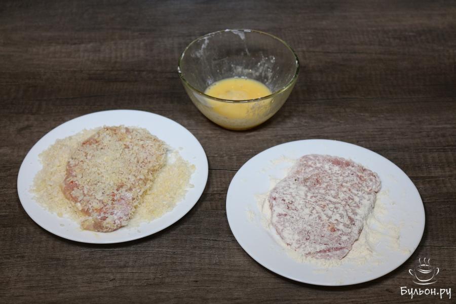 4. Теперь обваляйте кусочки свинины в муке, стряхните лишнюю. Далее свинину обмакните в яичную массу, затем обваляйте с сухарях с сыром.