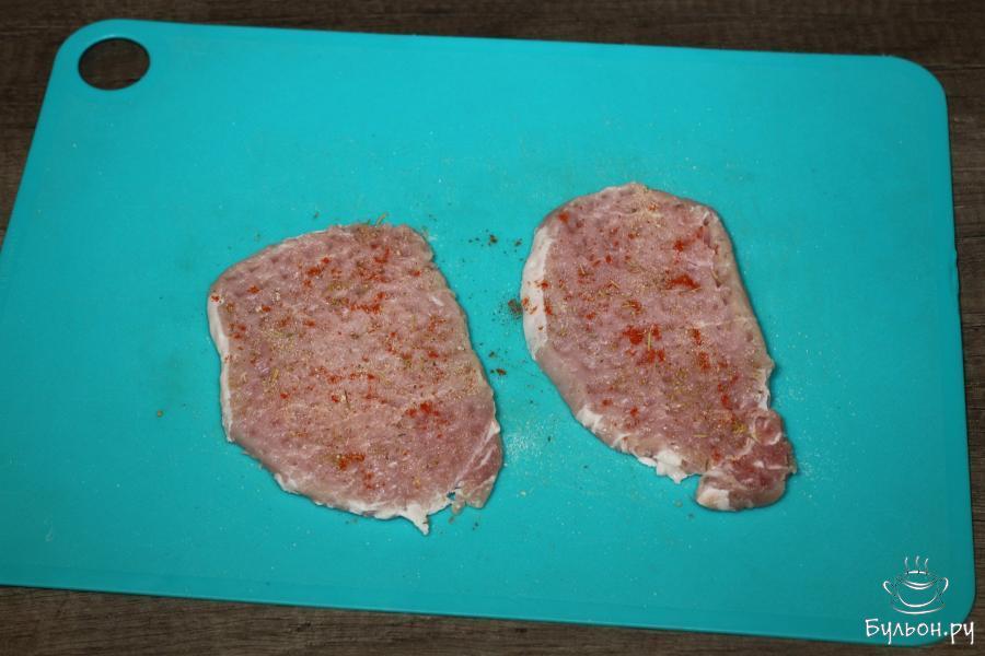 1. Свинину нарежьте на не толстые кусочки, слегка отбейте молотком. Посолите, приправьте молотым чесноком и другими специями.