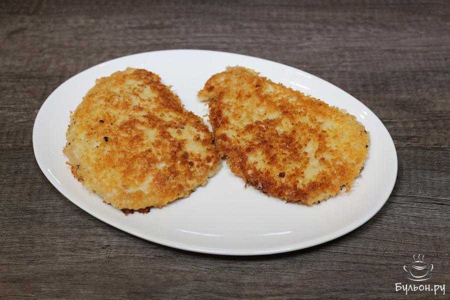 5. Нагрейте сковороду с растительным маслом и выложите в нее мясо в панировке. Обжарьте в масле свинину с двух сторон по 3 минутки с каждой.