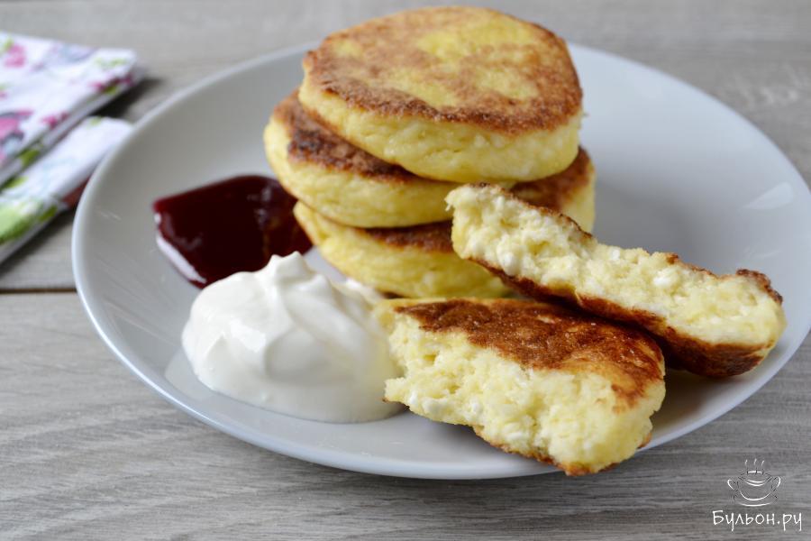 Сырники - как же это вкусно! Идеальное блюдо для завтрака, для начала рабочего дня. Для того, чтобы сырники "удались", необходимо придерживаться трех моментов: 1. Творог не должен быть очень влажный. 2. Сахара много добавлять не нужно. 3. Много яиц тоже не добавляйте. Сахар и яйца сделают творог жидким, придется его загущать мукой, а это нежелательно. Вместо кукурузной муки можно использовать пшеничную, рисовую или манку. Жарить сырники нужно на слабом огне под крышкой.