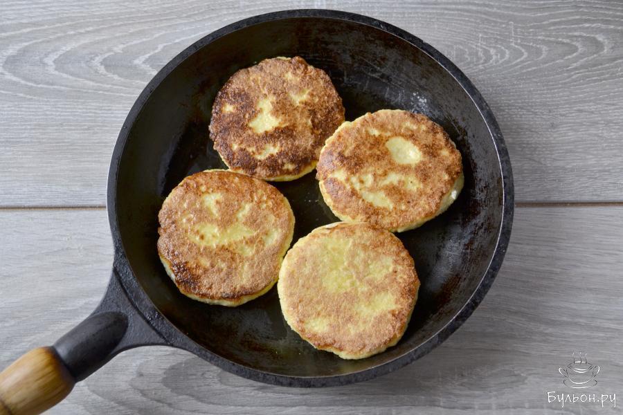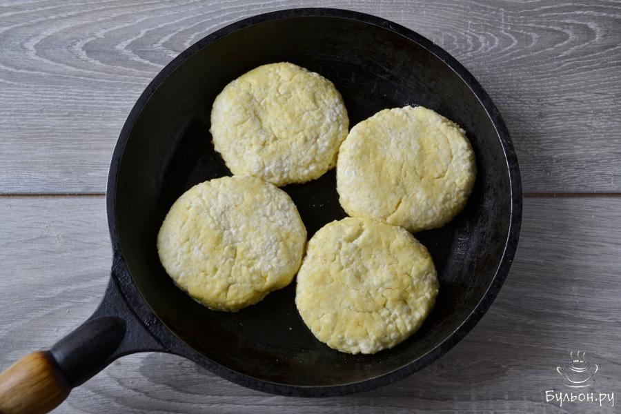 7. Разогреть сковороду с растительным маслом и выложить в нее сырники. Под крышкой, на самом слабом огне, обжарить сырники до румяной корочки.