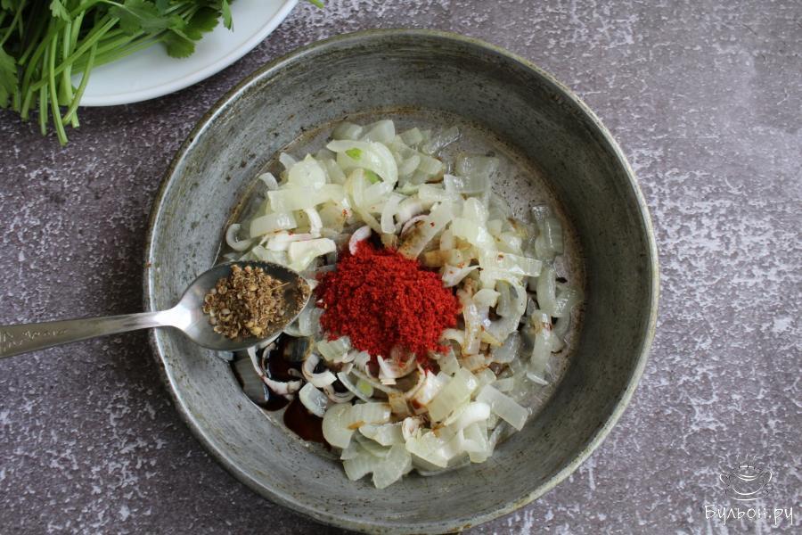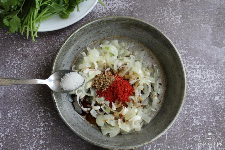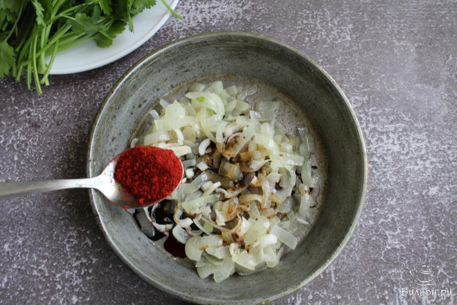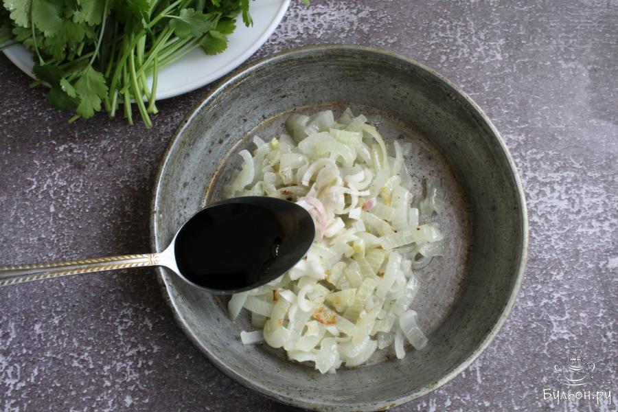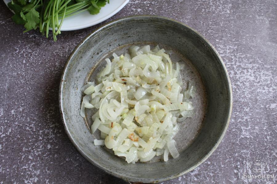 2. Лук почистить, промыть, нарезать тонкими полосками и обжарить на сковороде с разогретым маслом до мягкости.