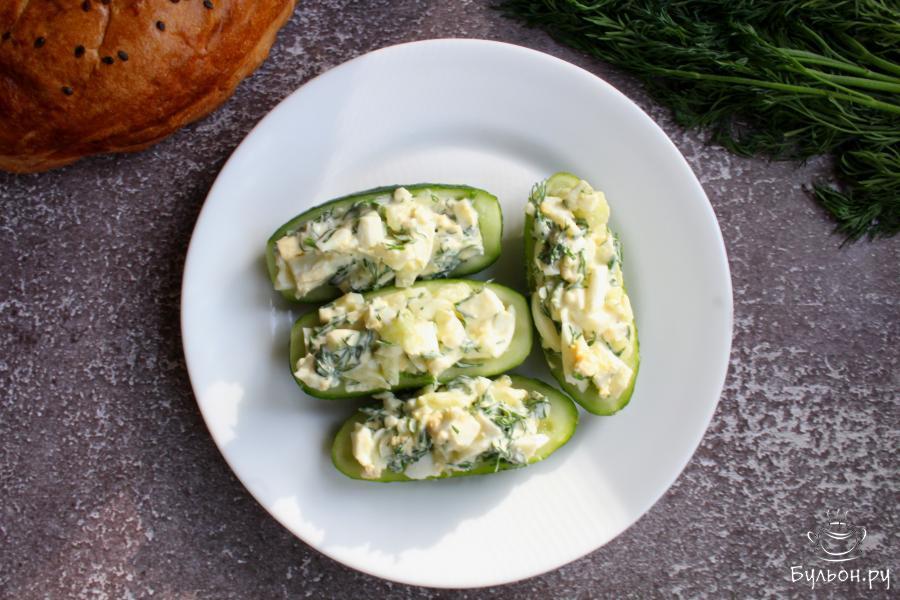 Фаршированные огурцы с яйцом и зеленью - это быстрая, вкусная и легкая закуска, которая понравится многим. Начинку для таких фаршированных огурцов можно приготовить самую разнообразную, вполне можно прибавить свежую молодую капусту, помидоры, любимую душистую зелень. Закуска исчезает со стола очень быстро, хрустящие огурчики с аппетитным наполнением, это очень вкусно. Начинку по желанию можно заправить пресной сметаной.