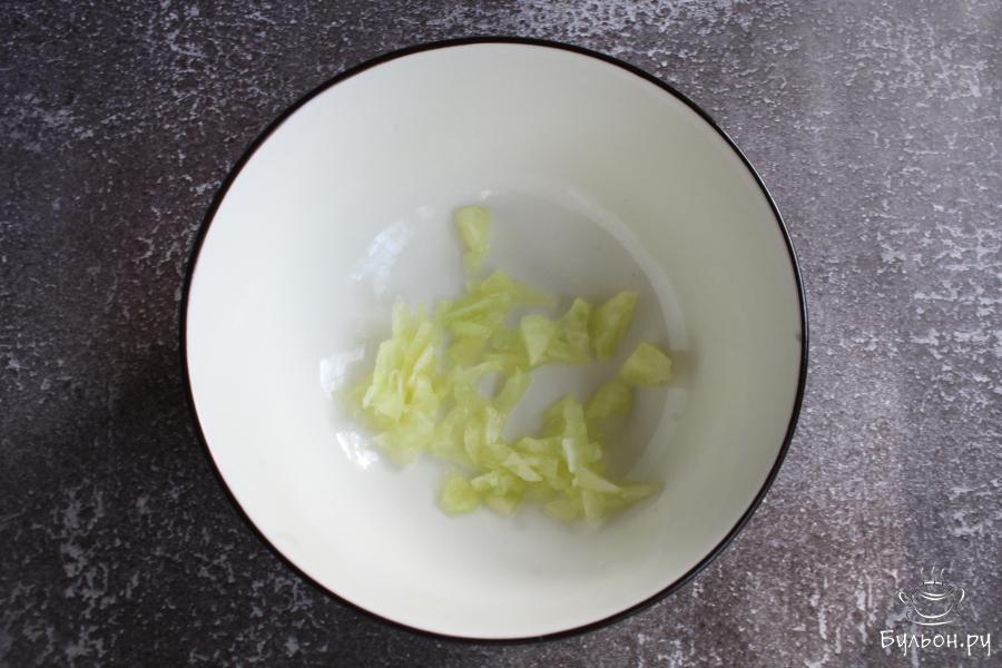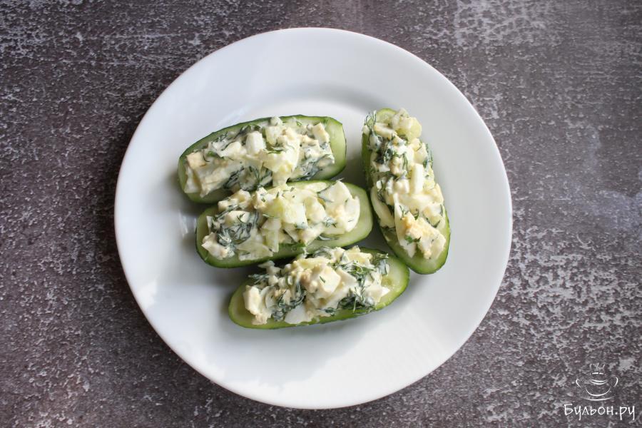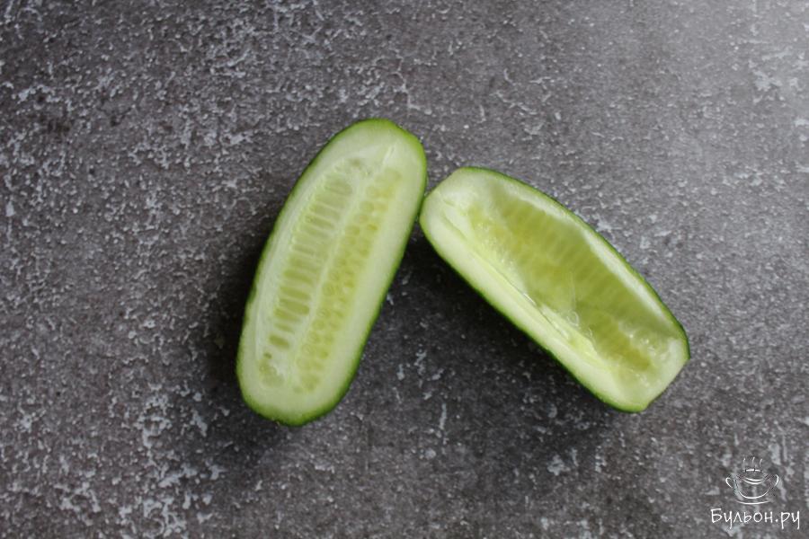 1. Огурцы промыть, разрезать вдоль пополам. Сердцевинку у половинок огурцов вырезать, чтобы из них получились лодочки.