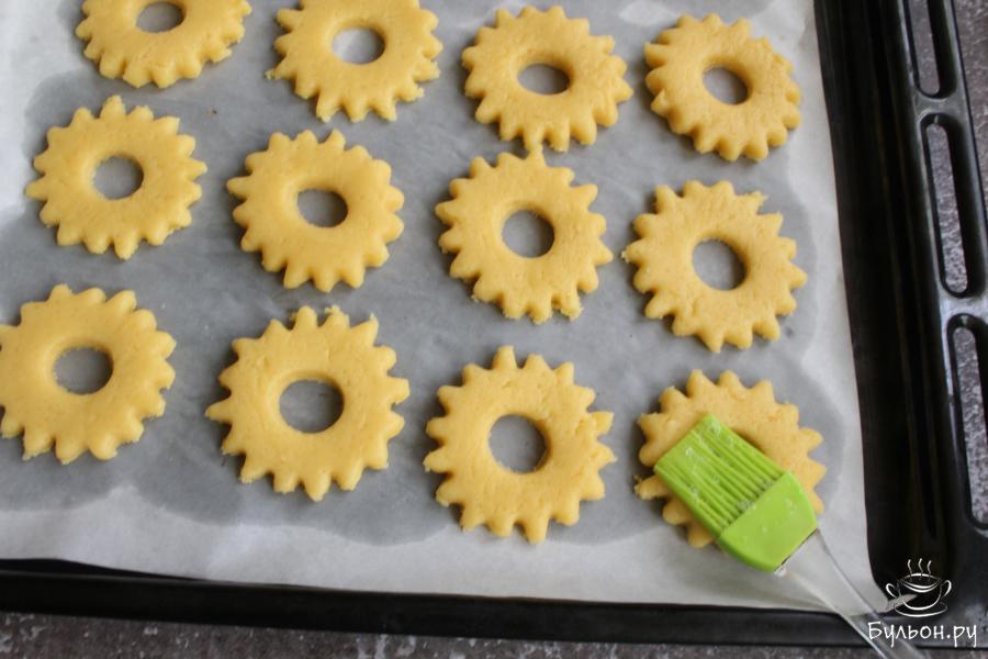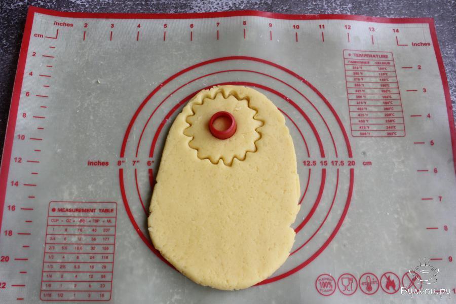 5. Тесто раскатать в пласт толщиной около 1 см. Вырезать формочкой круглые печеньки, серединку вырезать мелкой круглой формочкой.