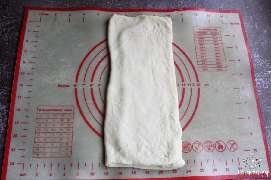 8. Опять смазать пласт теста маслом и сложить также, но теперь складывать слева-направо. И опять раскатать тесто в тонкий пласт и повторить так еще раз, смазать маслом, сложить книжкой, раскатать тонко.