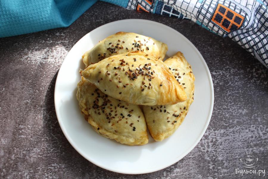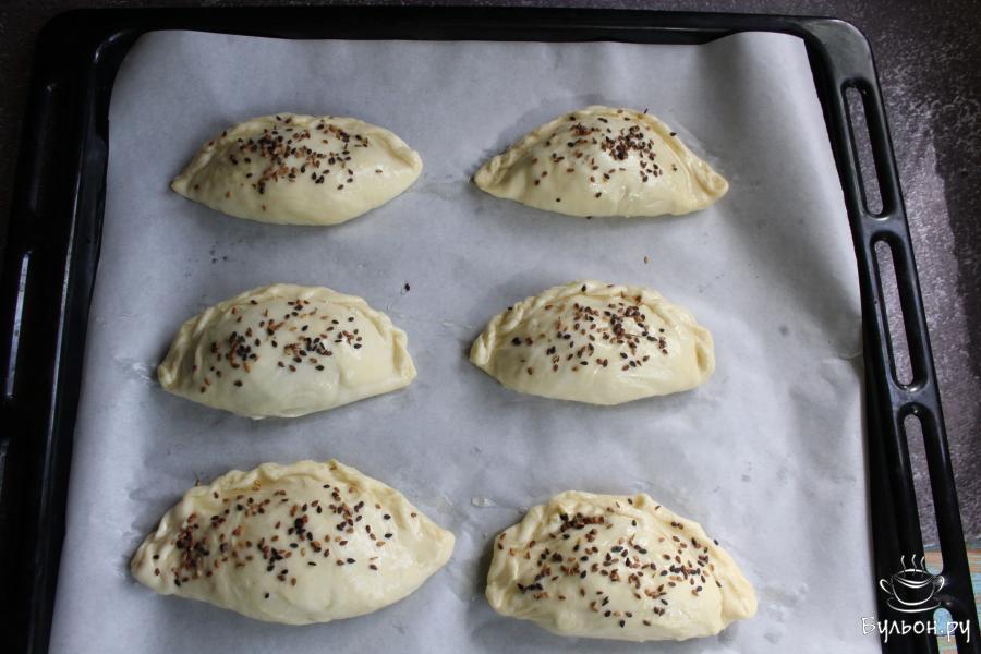 16. Сформировать пирожки по типу вареников, хорошо защипнуть края. Выложить пирожки на противень, смазать взбитым яйцом и украсить белым или черным кунжутом.