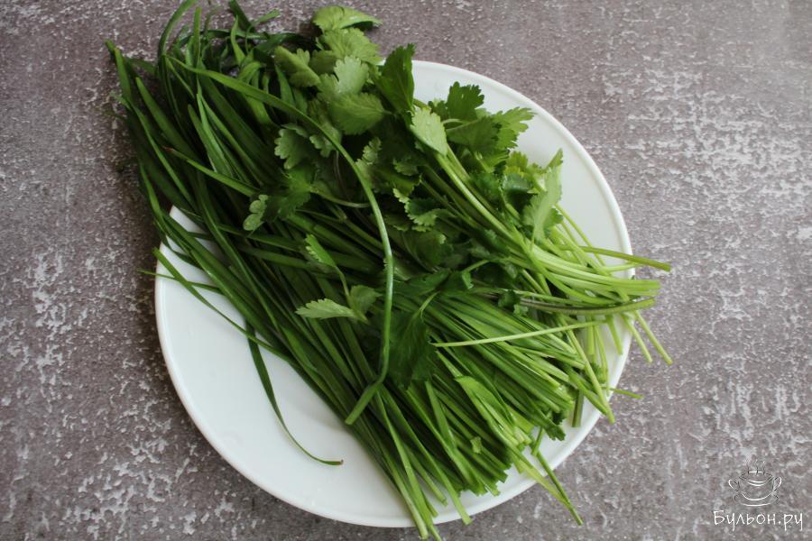 4. Пока тесто "отдыхает", подготовить зелень для начинки. Для этого лук джусай и кинзу промыть, перебрать и обсушить.