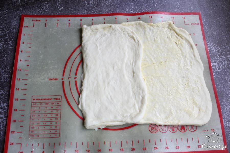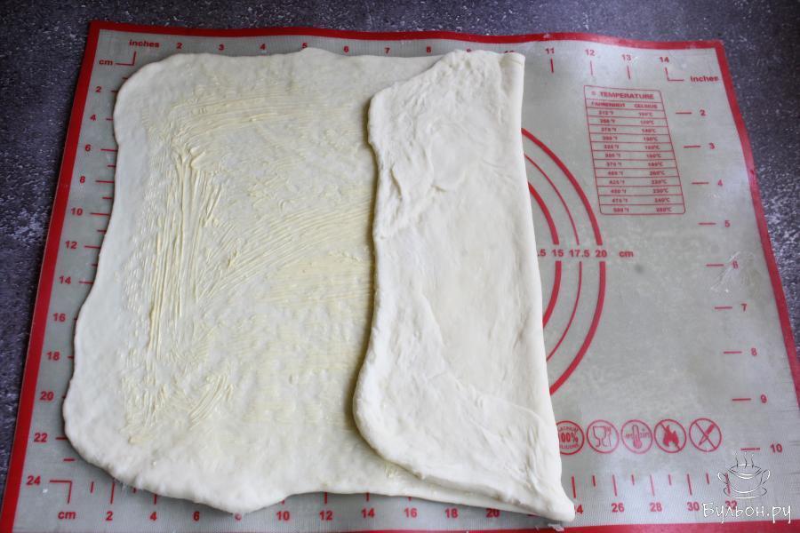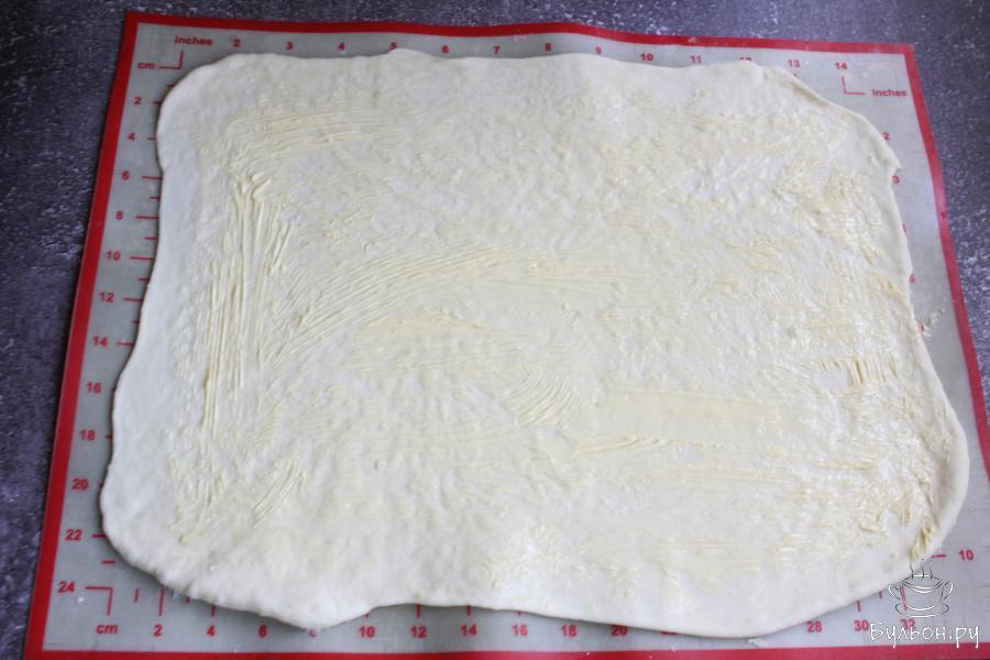 5. Затем, еще раз хорошо вымесить тесто и раскатать его в тонкий, прямоугольный пласт. Смазать тесто, не очень густо, мягким сливочным маслом.