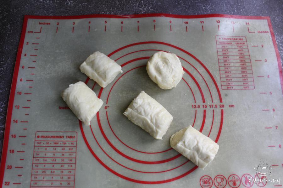 14. Из морозилки достать тесто, нарезать рулет на кусочки длиной около 3-4 см. Перед раскатыванием, все кусочки теста повернуть слоями вверх и немного сплющить их рукой.