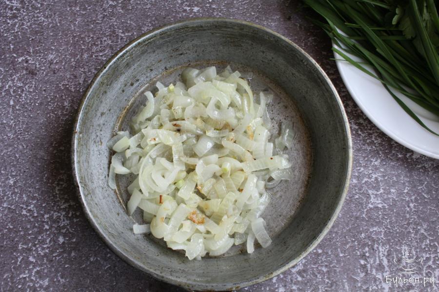 10. Пока тесто лежит в морозилке, подготовить начинку. Лук почистить, промыть, мелко нарезать и обжарить на оставшемся растительном масле до мягкости.