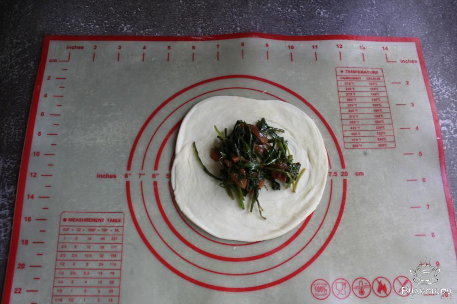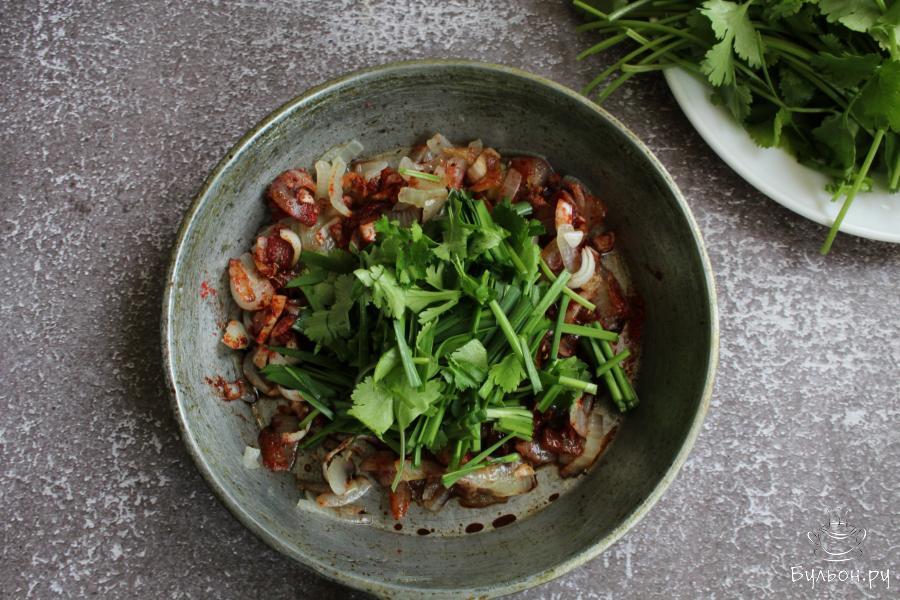 13. Промытую зелень крупно нарезать, добавить на сковороду и тушить все вместе 5 минут. Перемешать. Если нужно, то начинку можно посолить.