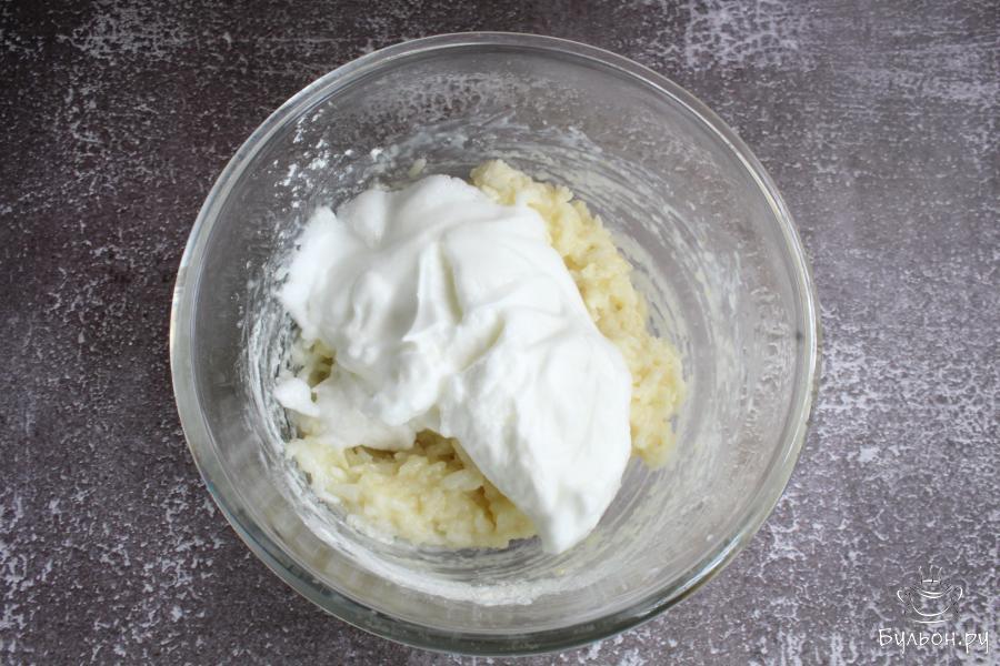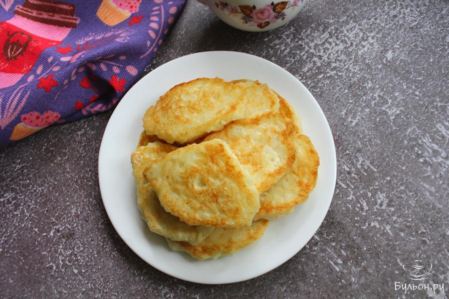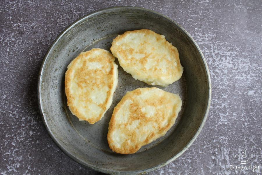 9. Масло разогреть на сковороде. Выкладывать оладьи столовой ложкой и жарить их по 2-3 минуты с каждой стороны.