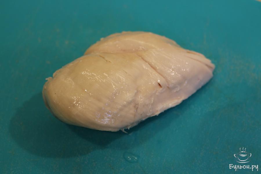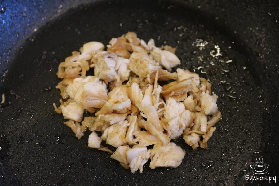 2. Нарежьте курицу на кусочки, выложите их на сковорду с раститеьным маслом и обжарьте в течение минут 5. Затем все кусочки соберите вместе примерно в размер кусочка черного хлеба.