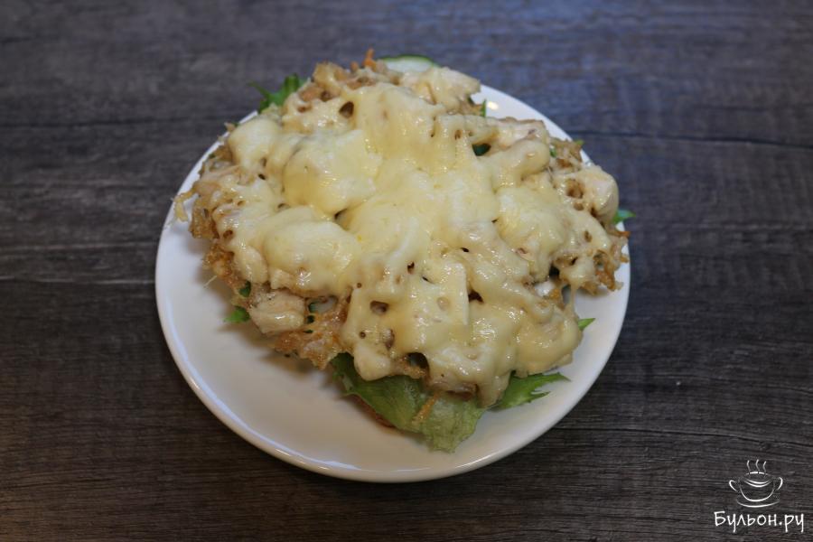 3. Натрите сыр на мелкой терке. Выложите его сверху на курицу по всему периметру. Сковороду накройте крышкой и готовьте, пока сыр не начнет плавиться.
