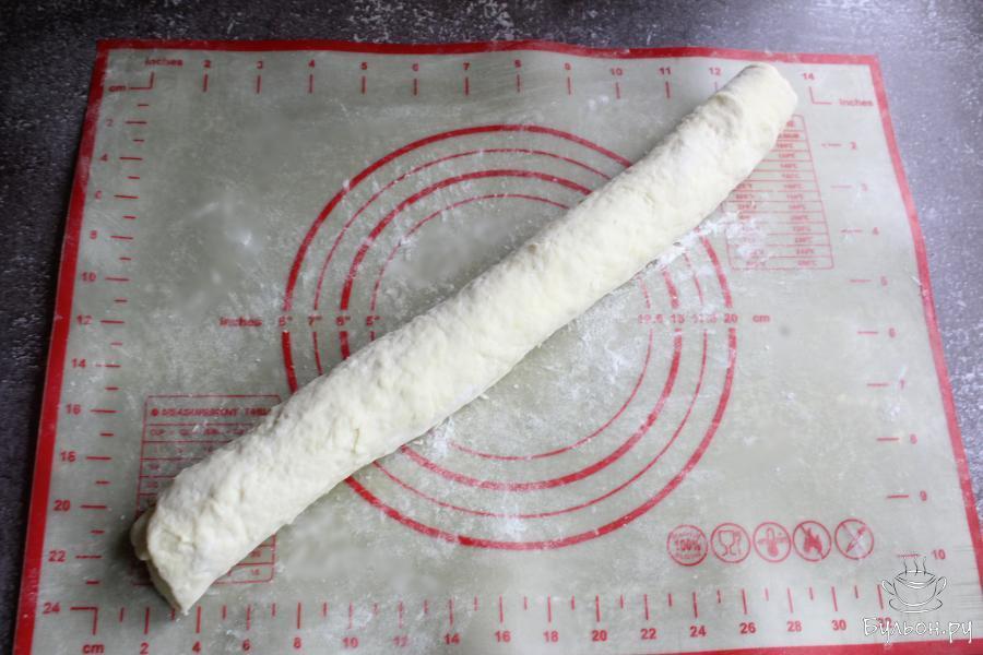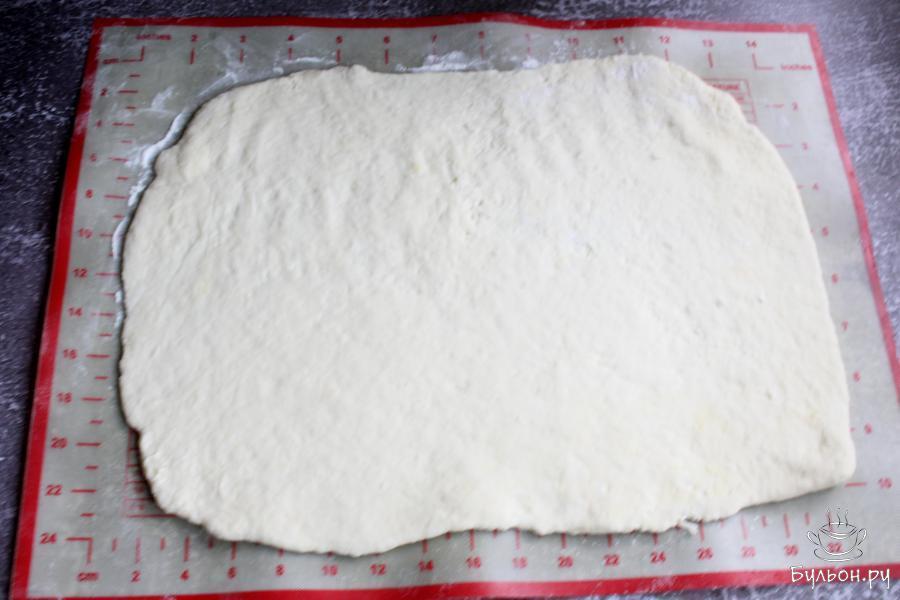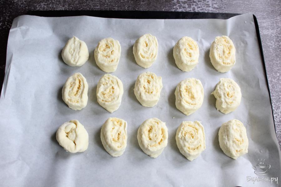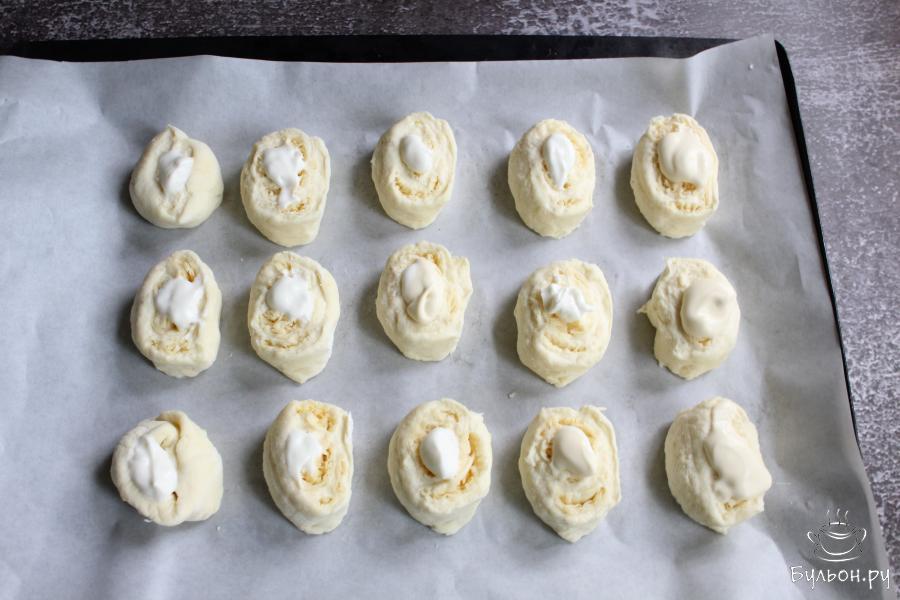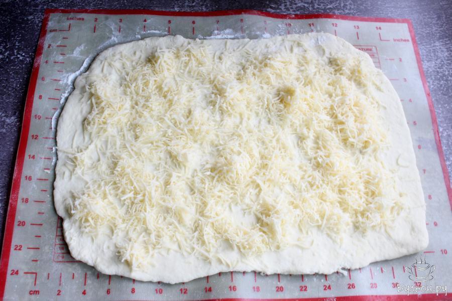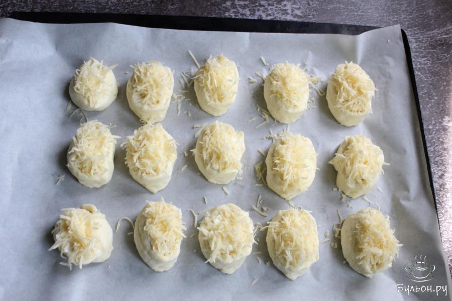 5. Равномерно разложить по тесту большую часть тертого сыра. Немного сыра оставить для верха булочек.