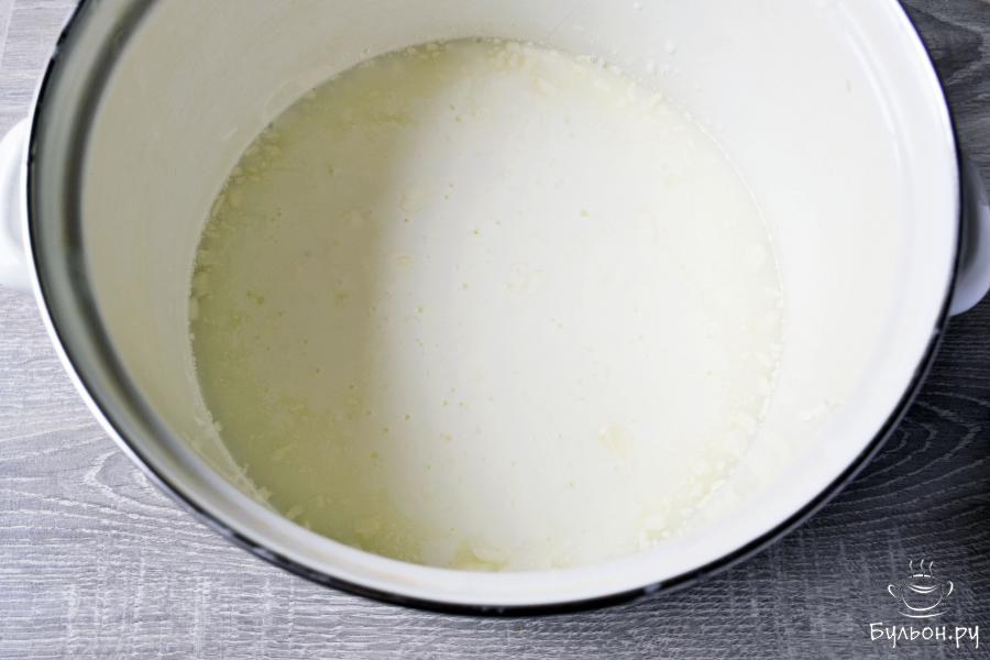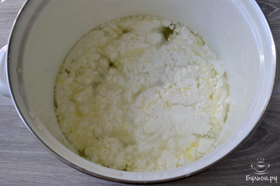 2. На самом слабом огне нагревайте молоко до того времени, как начнет отделяться сыворотка и кислое молоко начнет створаживаться. Самое главное, не перемешивайте молоко и не доводите его до кипения. Молоко створожилось, снимите кастрюлю с плиты и оставьте при комнатной температуре до полного остывания.