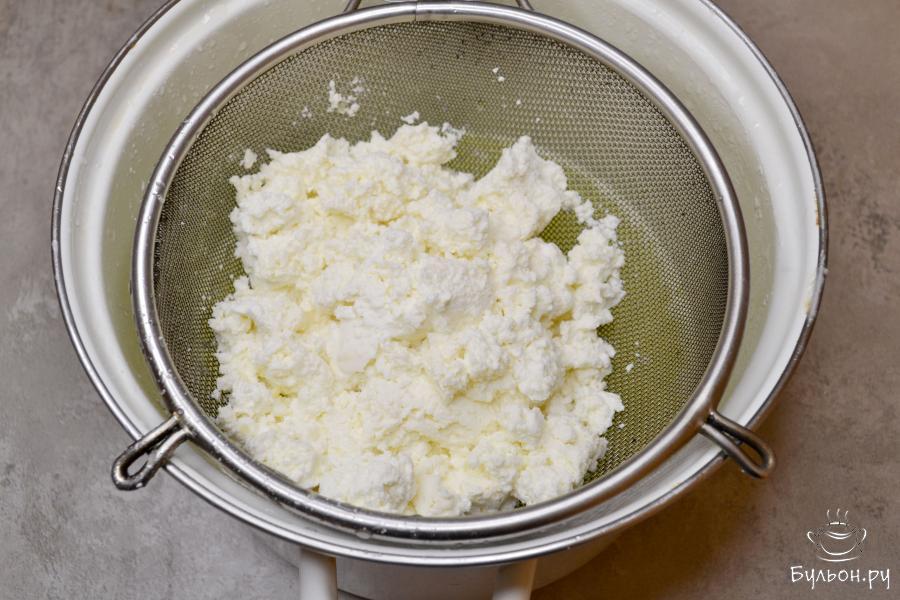 3. Затем перелейте содержимое кастрюли в дуршлаг или сито, застеленное марлей, сложенной в 2-3 слоя. Сыворотка стечет в кастрюлю, творог останется в дуршлаге.