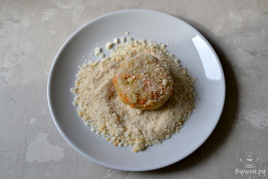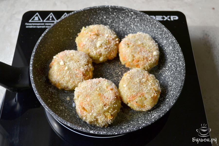 10. Хорошо разогрейте сковороду с растительным маслом и положите на нее котлеты. Под крышкой, на огне ниже среднего, обжаривайте котлеты до румяной корочки примерно 10 минут.
