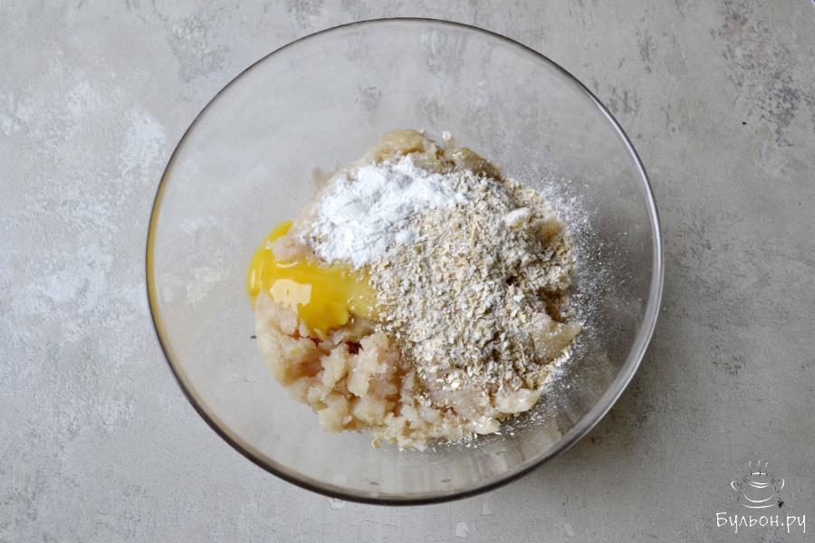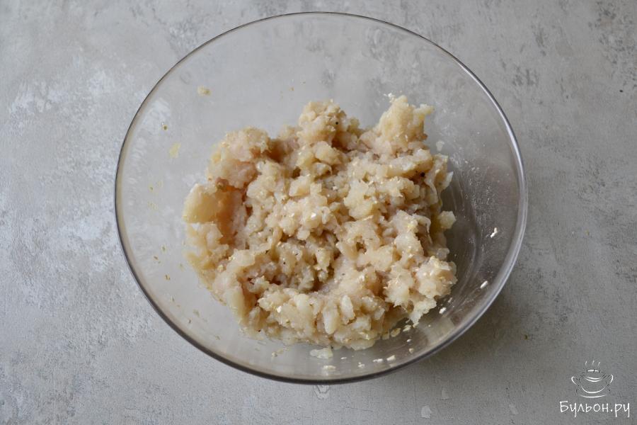 1. В глубокую миску с рыбным фаршем разбейте яйцо, немного посолите и поперчите. Я использую щучий фарш.