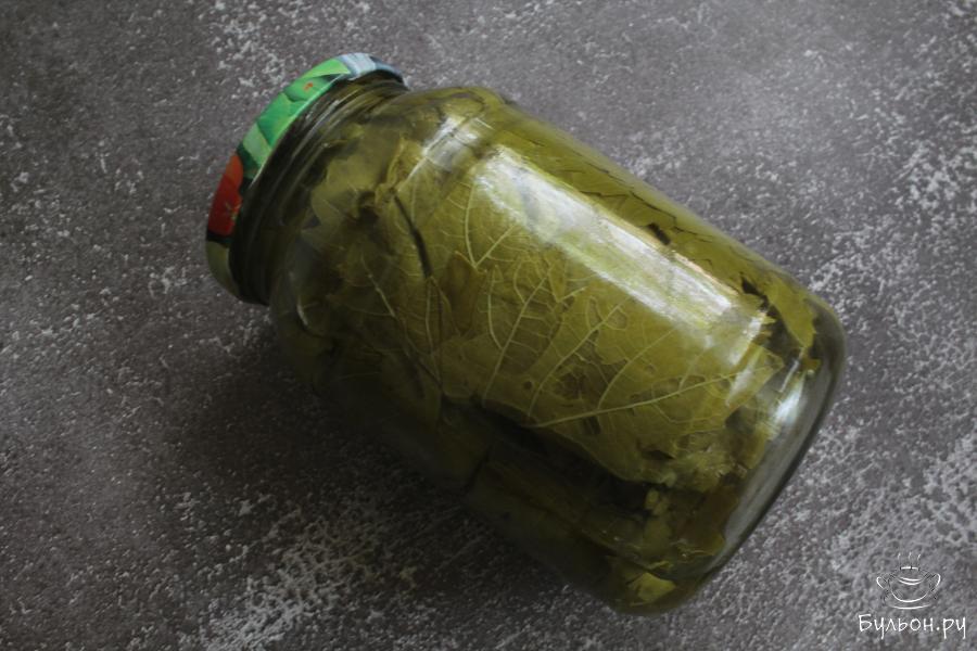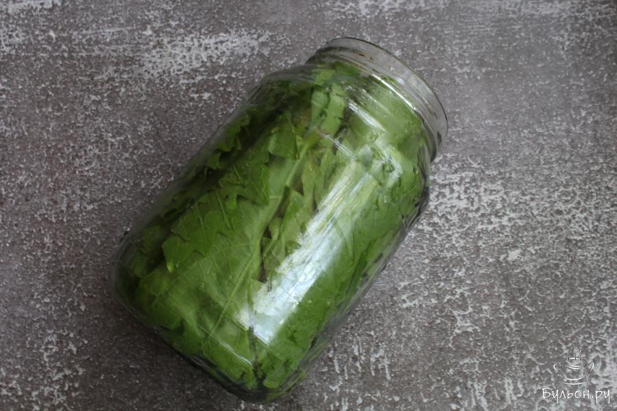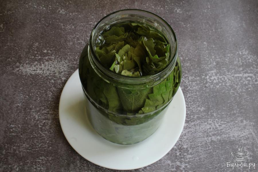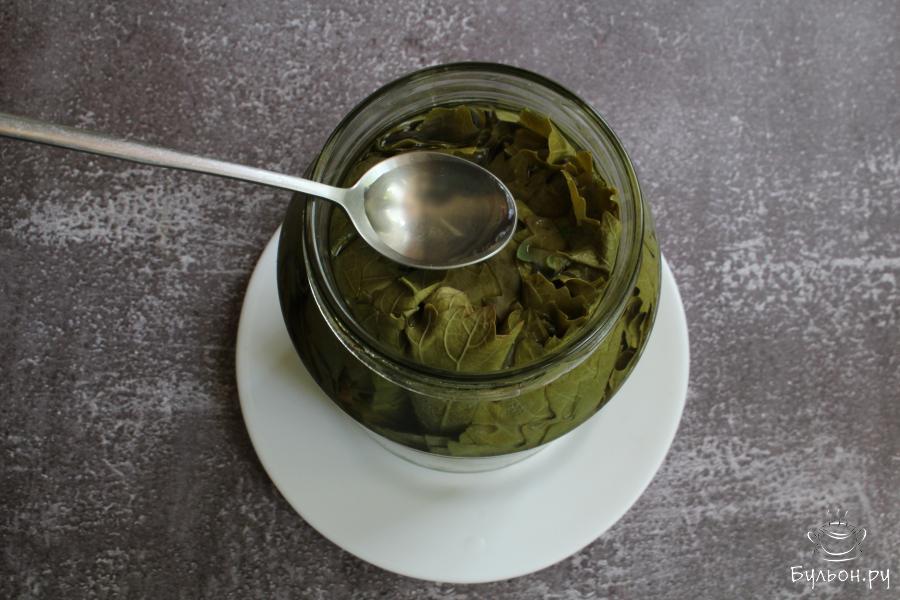 6. Воду с банок слить. Залить листья кипящим маринадом и добавить в каждую банку по 1 ст. л. 9% уксуса.