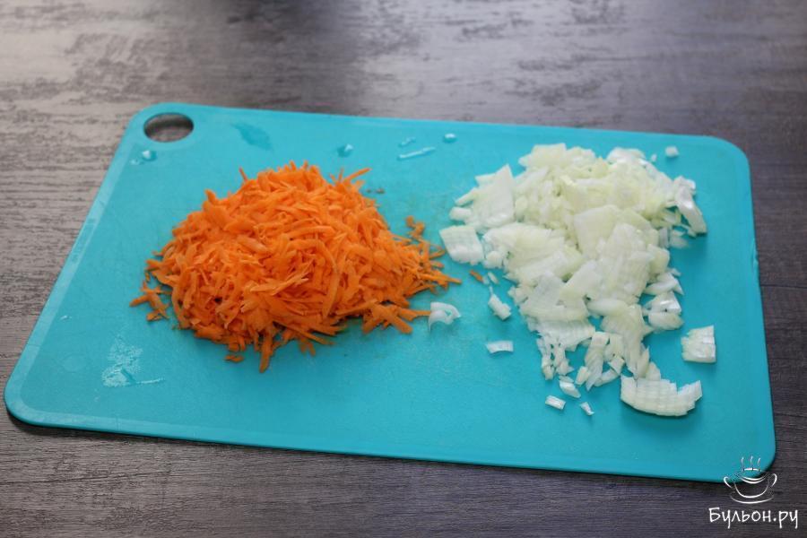 1. Морковь и лук очистите. У меня были среднего размера. Морковь натрите на крупной терке, лук порежьте мелкими кубиками.