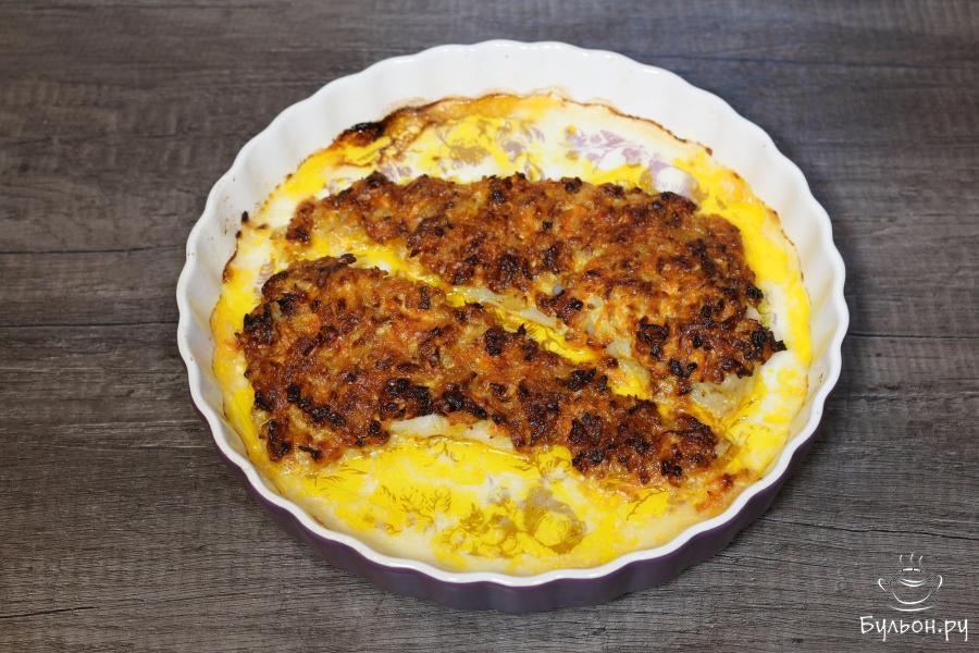7. Запекайте рыбу под овощами в течение 25 минут при 180 градусах Цельсия. Затем достаньте из духовки. Минтай под морковно-луковой шубкой готов.