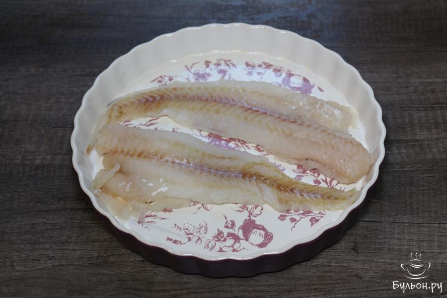 5. Филе минтая вымойте, промокните бумажными полотенцами и выложите на форму для запекания. Филе подсолите.