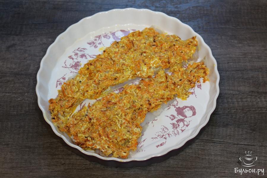6. Затем, выложите на каждое филе по половине морковно-луковой массы, смешанной с майонезом. Равномерно распределите ее по кусочкам минтая.